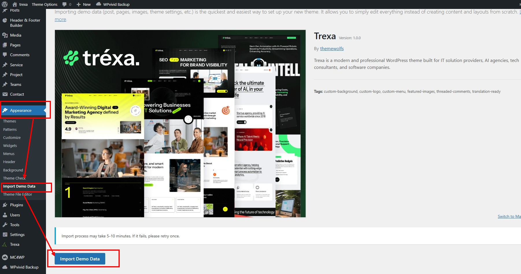 - Browse to the trexa.zip file and click Install now for the theme to be uploaded and installed.